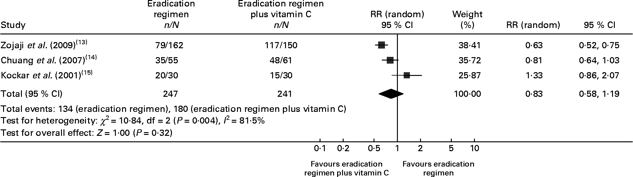 A total of three RCT compared the eradication regimen v. eradication regimen plus vitamin C only in patients with H. pylori infection( Reference Zojaji, Talaie and Mirsattari 13 – Reference Koçkar, Oztürk and Bavbek 15 ). Of the three trials, one( Reference Zojaji, Talaie and Mirsattari 13 ) used PPI, bismuth subcitrate plus two antibiotics as eradication therapy; the other two( Reference Chuang, Sheu and Kao 14 , Reference Koçkar, Oztürk and Bavbek 15 ) used PPI plus two antibiotics. The mean dose of vitamin C varied from 500 to 1000 mg/d. In different trials, the patients received the eradication therapy or eradication therapy plus vitamin C for 1 or 2 weeks (Table 3).